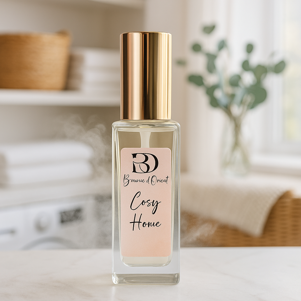 La brume de linge Cosy home enveloppe vos tissus d’un voile délicat et parfumé qui crée une atmosphère cocooning et fraîche. Fabriquée à la main dans l’atelier de Brume d’Orient, elle est composée d’ingrédients naturels et sans alcool. Elle neutralise durablement les odeurs révélant un parfum subtil et délicat.