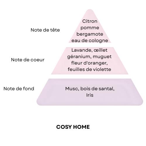 - Notes de coeur : Lavande, oeillet, géranium, muguet, fleur d'oranger, feuilles de violette