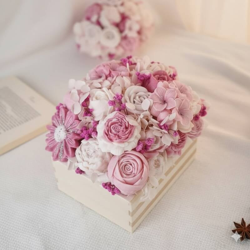 Laissez-vous séduire par notre composition parfumée unique : un bouquet de fondants décoratifs mêlant cire végétale et parfums de haute qualité. Bien plus qu’un simple objet déco, chaque création est une invitation à éveiller les sens.